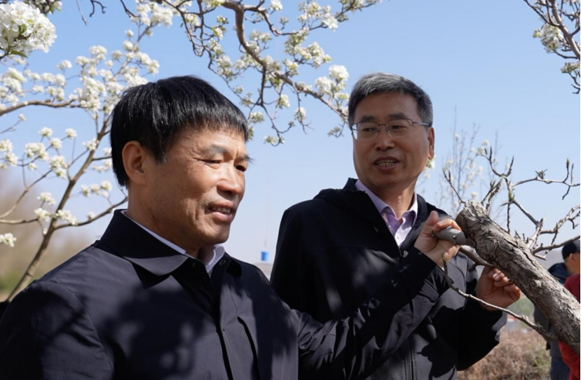 (中国工程院院士、南京农业大学教授、国家现代农业梨产业技术体系首席科学家张绍铃与辽宁省果树科学研究所梨团队首席、国家梨产业体系营口综合试验站站长沙守峰察看梨花长势。)